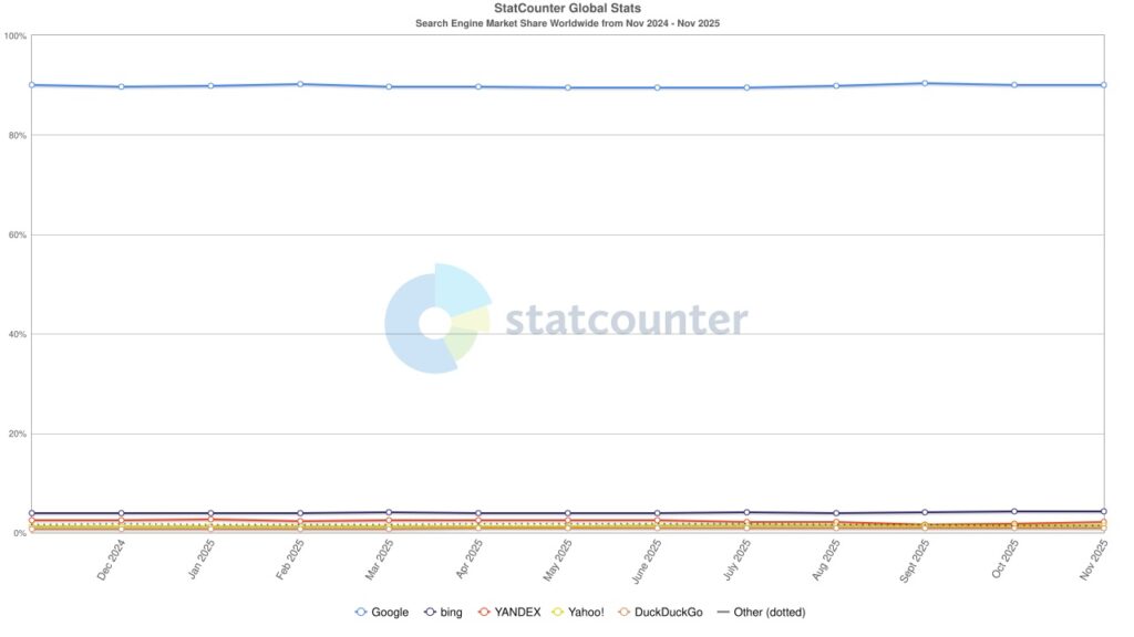 StatCounterが提供している、無料のブラウザ訪問者統計ツール「StatCounter Global Stats」によると、2024年11月から 2025年11月にかけての全世界検索エンジンシェア率は、Googleが89.94%であることが判明しました。