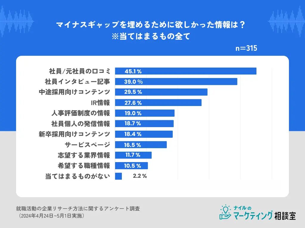たとえば、入社後のギャップでは、「想定より残業が多かった」「聞いていた業務と違った」といった不満が集まるでしょう。