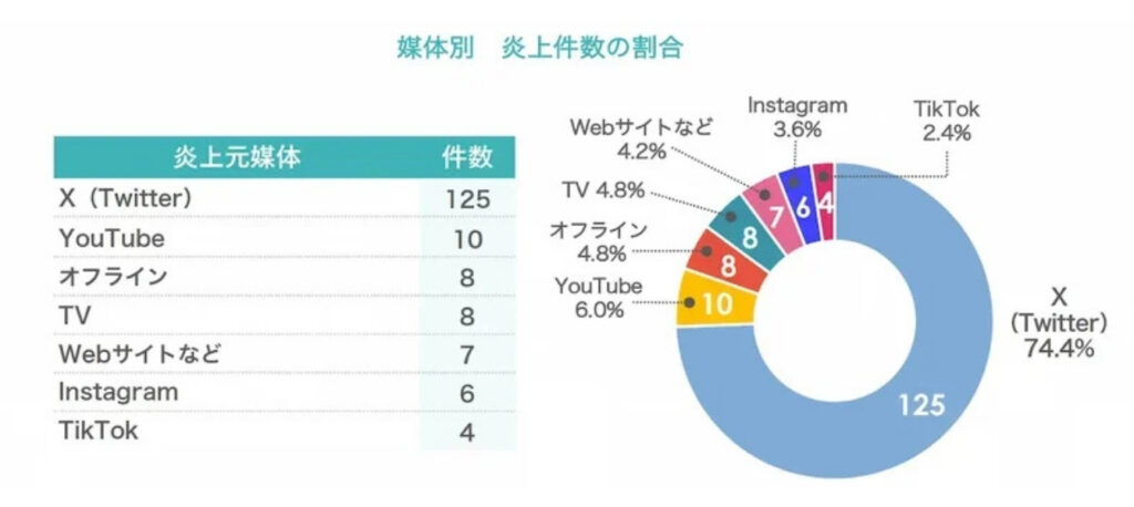 SNSは情報拡散力が極めて高く、企業の評判に直結するリスクを抱えています。特にX(旧Twitter)は炎上件数が突出して多く、2022年は全体の74.4%にあたる125件、2023年も47.3%で最多となっています。